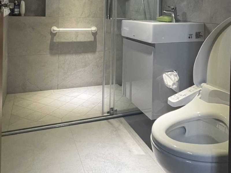 整體風格:採用現代灰階石紋磁磚,搭配嵌燈與平滑天花板,整體質感瞬間升級,視覺乾淨俐落。 淋浴空間:拆除老式浴缸,增加使用彈性與空間感。 馬桶/洗手台:換上白色現代馬桶與懸掛式洗手台,既美觀又方便清潔。